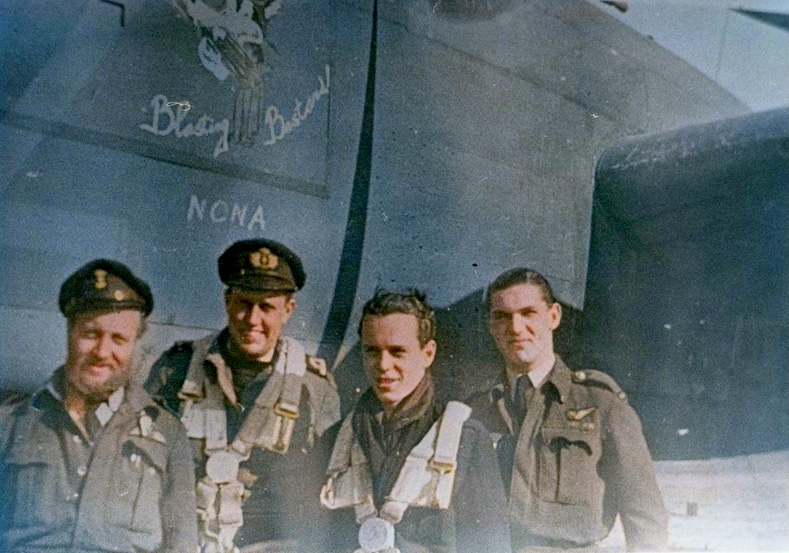 In Maart 1943 poseerde een vierkoppige bemanning van deze eenheid voor hun North American B-25J Mitchell middelzware bommenwerper met registratienummer KJ596/Z op vliegbasis Melsbroek.