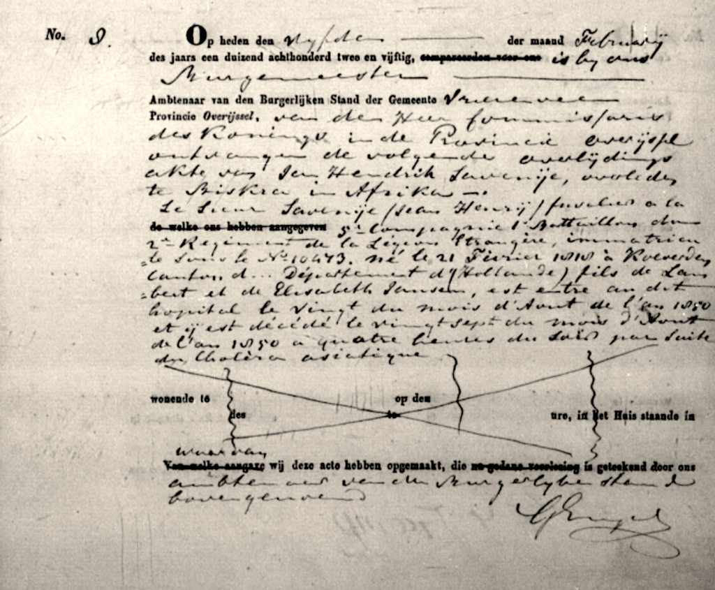 Op 5 februari 1852 werd in het Register van overlijden van Vriezenveen het overlijden geregistreerd van ene Sieur Savenij (Jean Henrij). Geregistreerd werd een transcriptie van een Franse overlijdensakte.