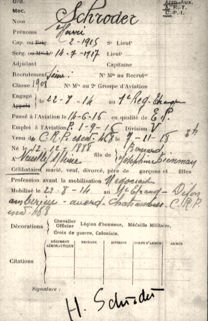 Op 14 juni 1916 nam Henri Schröder dienst bij de Service Aéronautique van het Franse leger.