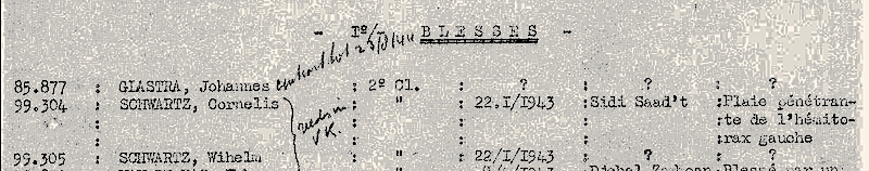 Bij Cornelis Schwarz staan de datum 22-01-1943 , plaats Sidi Saad’t en aard van de verwondingen.