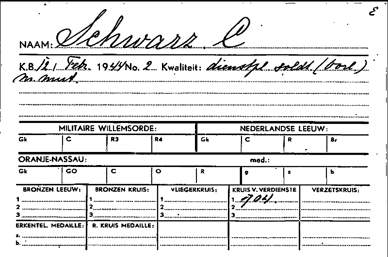 Op 18 november 1943 verklaarde Cornelis Schwarz in Londen tegenover A. Wolters van de PBD [8] het volgende: