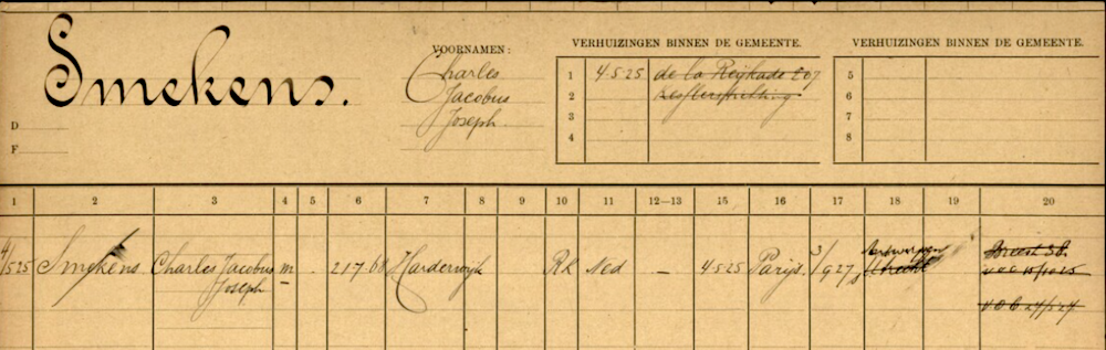 Charles J.J. Smekens bleef op basis van de registratie op zijn persoonskaart tot 3 september 1927 in Den Haag. Aangegeven werd dat hij daarna Antwerpen was vertrokken.