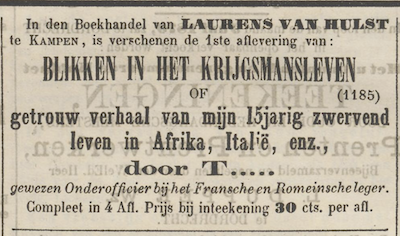 Op 5 februari 1870 verscheen er in de “Zutphensche courant” een advertentie waarin de openstelling voor de intekening voor een boek met de titel “Blikken in het Krijgsmansleven” werd aangekondigd.