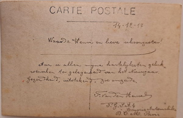 Op de achterkant hiervan vermelde hij zijn eenheid P.G.S.A. 4 Convois Automobiles.