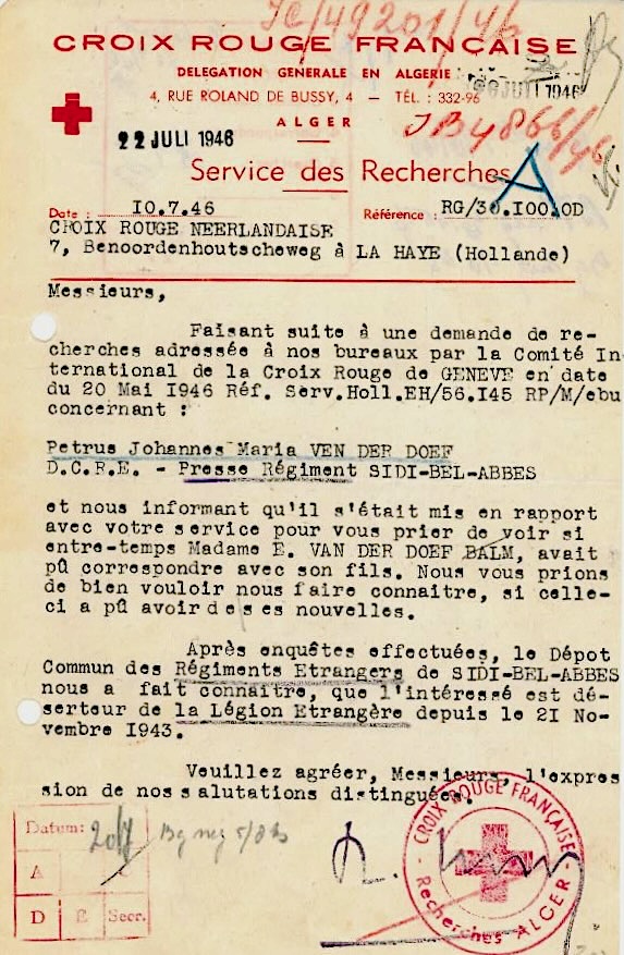 Op 10 juli 1946 stuurde het Franse Rode Kruis een korte brief als antwoord waar in stond dat haar zoon sinds 21 november 1943 te boek stond als deserteur.