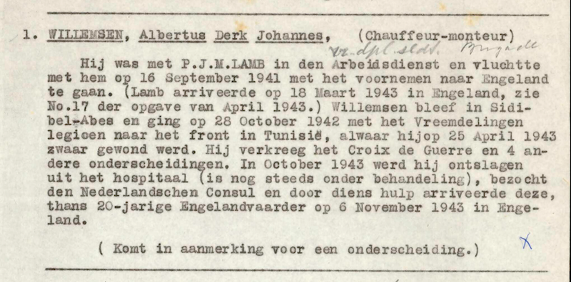 Albertus D.J. Willemsen is op 2 juli 1923 in Arnhem geboren. Hij is dienstplichtig soldaat en verlaat bezet Nederland op 25 augustus 1941. Hij loopt in ruim 2 weken naar Marseille en meldt zich daar voor het Vreemdelingenlegioen in Noord-Afrika. Hij wordt opgeleid in Saïda (Algerije) en daarna geplaatst in het 1ste Regiment Entrugene. Na de landing van de Engelsen en Amerikanen trekt hij mee naar Tunesië en doet hij mee aan de veldtocht. Enkele maanden later raakt hij gewond bij de Sidi Abelkrim (Marokko), hetgeen hem in het hospitaal in Blida (Algiers) enkele onderscheidingen oplevert. Negen maanden later wordt hij uit het hospitaal ontslagen. Hij meldt zich bij de Nederlandse consul in Algiers die ervoor zorgt dat hij, samen met Jan Overvoorde, naar Engeland wordt overgebracht, waar ze op 6 november 1943 aankomen.